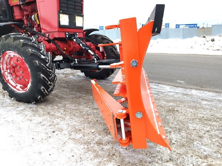 Состоит из плиты, лопаты и пружины в сборе. Лопата крепиться на плиту шарнирно, при помощи оси. На этой же оси закреплены две щеки, соединённые на балке плиты. В сборе пружина на лопате закреплена через проушину фиксатором. Она поддерживает лопату в рабочем положении. При подходе к барьерной стойке (либо другому препятствию) подпружыненная лопата отклоняется и проходит, не повредив стойку. Пройдя препятствие лопата возвращается в исхопное положение и продолжает выдавливать снег из подбарьерного пространства. Полусферические опоры, закрепленные осями через проушины на плите, позволяют плавно скользить отвалу по поверхности. В транспортном положении лопата устанавливается впереди плиты и фиксируется крючком.
